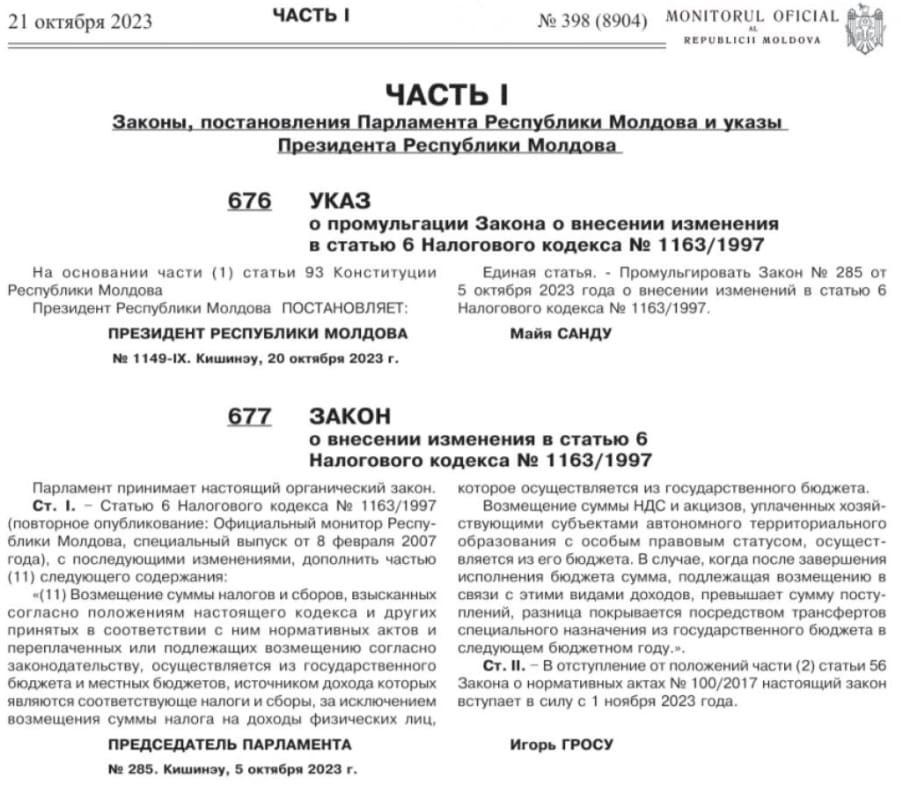 Власти Гагаузии должны будут возмещать НДС предпринимателям из местного бюджета, а не из государственного, как это было раньше. Соответствующий законопроект промульгировала Майя Санду. Его опубликовали в Официальном мониторе в субботу, 21 октября.