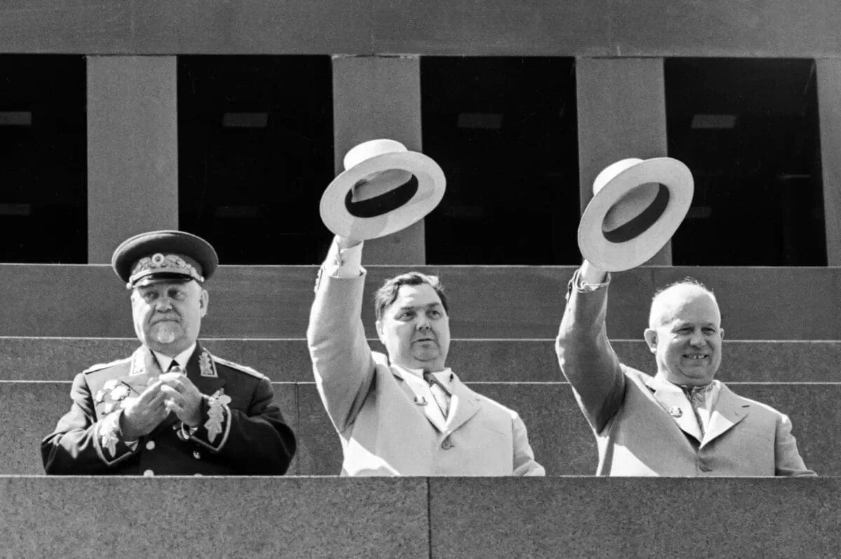 1 мая 1954 года. Маленков и Хрущев шляпами демонстрируют единство