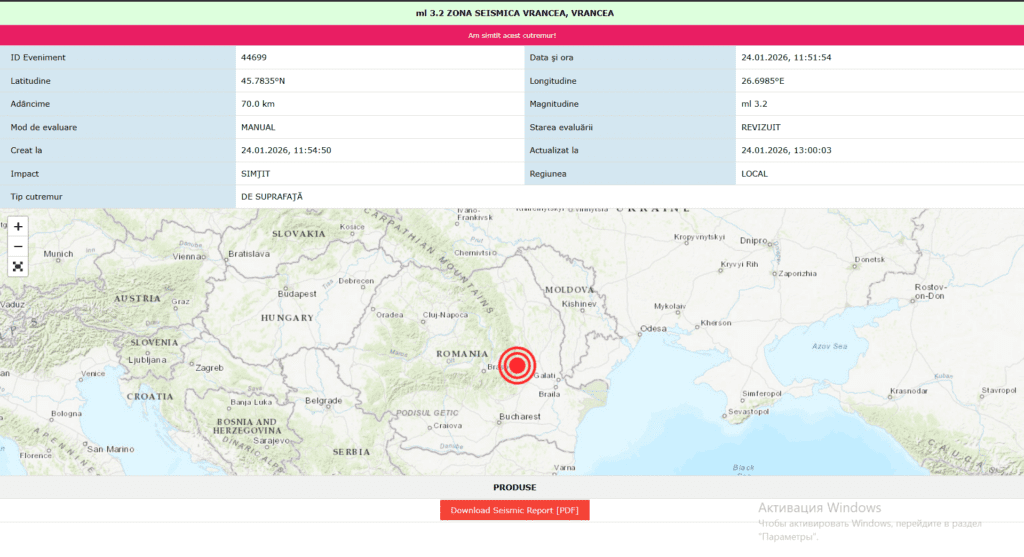 В субботу, 24 января, в 11:51 в сейсмической зоне Вранча произошло землетрясение. Магнитуда подземных толчков составила 3,2 по шкале Рихтера. Об этом сообщает Румынский Национальный научно-исследовательский институт физики Земли (INCDFP).