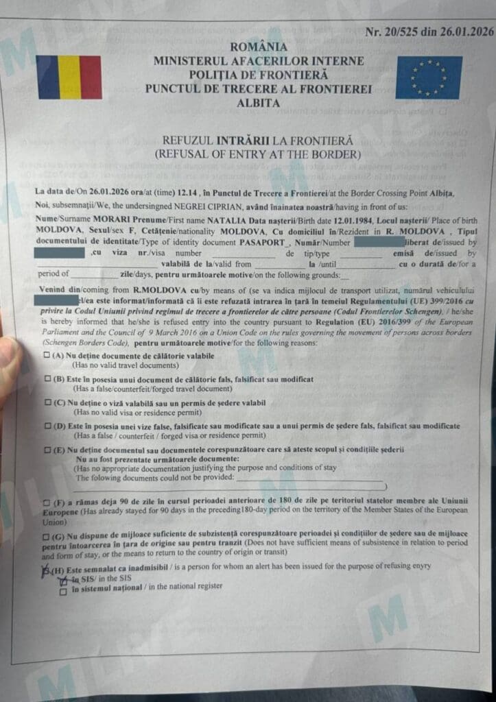 Журналистке Наталье Морарь отказали во въезде на территорию Румынии. Инцидент произошел на пограничном пункте пропуска Албица. Ей были предъявлены официальные документы, подтверждающие наличие запрета на пересечение границы. Об этом сообщает Morari.news.